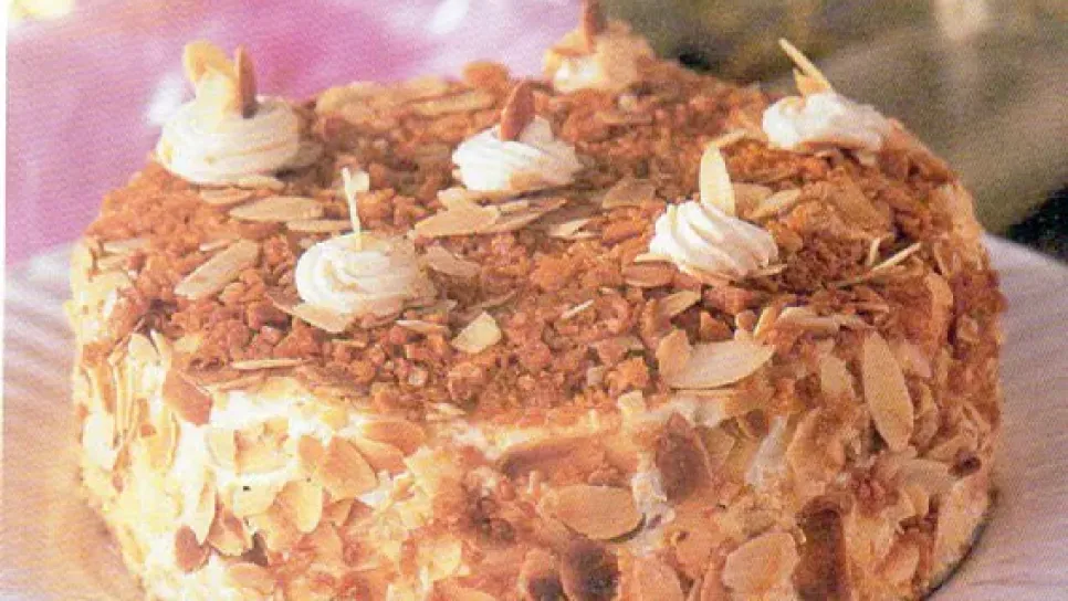 المكونات:بياض 5 بيضات مع ربع كوب سكر، صفار 5 بيضات مع نصف كوب سكر، كوب إلا ربع فرينة، رشة فانيليا. كريمة الزبدة: كوب حليب محلى مكثف بالكراميل، كوب ونصف كوب زبدة (300 غ) بحرارة الغرفة، بضعة قطرات من خلاصة اللوز.الطبقة العلوية: 200غ لوز محمص مفتت، كوب كاراميل سكر مطحون.التحضير:يحمى الفرن لدرجة 180 درجة مئوية. يخفق بياض البيض في خلاط ليصبح زغبا، يضاف إليه السكر تدريجيا ويتابع الخفق للحصول على مرنغ أبيض وكثيف.يخفق صفار البيض في وعاء آخر ليصبح شاحب اللون ويضاف إليه السكر، ويتابع الخفق حتى يذوب السكر. تضاف الفانيليا، يضاف الفرينة إلى مزيج صفار البيض للحصول على خليط كثيف، يضاف إليه بياض البيض المخفوق...