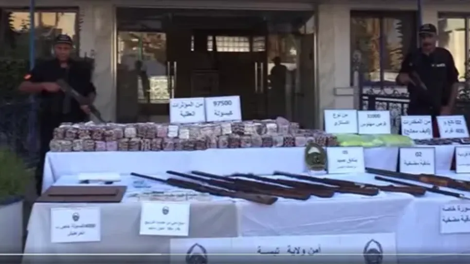 تمكن عناصر الشرطة تبسة، نهاية الأسبوع المنصرم، من وضع حد لنشاط شبكة إجرامية خطيرة كانت تهدد الأمن والاقتصاد الوطنيين والصحة العمومية مع استرجاع 9 أسلحة نارية وضبط كمية معتبرة من المخدرات، حسب ما أفاد به اليوم الأحد بيان لمصالح الأمن الوطني. وأوضح نفس المصدر أن عناصر الشرطة تبسة تمكنوا، نهاية الأسبوع المنصرم، من "وضع حد لنشاط شبكة إجرامية خطيرة تتكون من 3 أشخاص تنشط في المتاجرة بالمخدرات والمؤثرات العقلية والأسلحة النارية". وأضاف المصدر ذاته أن العملية "كللت باسترجاع 9 أسلحة نارية (5 بنادق صيد وبندقيتين مضخيتين ومسدسين من عيار 07 و09 ملم) إلى جانب 128500 قرص من المؤثرات العقلية و 2.4 كل...