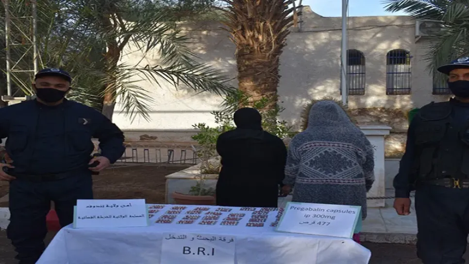 تمكنت فرقة من مصالح أمن ولاية تندوف من توقيف "م . خ " و " ف . ع " تنحدران من إحدى ولايات الغرب الجزائري والجنوب الغربي، وتقيمان بولاية تندوف حيث تم العثور في مسكنيهما على كمية من المواد الصيدلانية نوع بريقابالين "pregabalin capsules ip 300mg " ذات اللون الأحمر والأبيض قدرت بـ 477 قرص على شكل 32 مشط. ومن خلال مجريات التحقيق تبين أن المواد المحجوزة هي ملك للمدعو" ن . م " البالغ من العمر 29 سنة، ينحدر من إحدى ولايات الشرق الجزائري ويقيم بولاية تندوف. وتم تقديم المتهمين أمام الجهات القضائية لدى محكمة تندوف عن قضية الحيــازة وعرض مواد صيدلانية على الغير بدون رخصة عن...