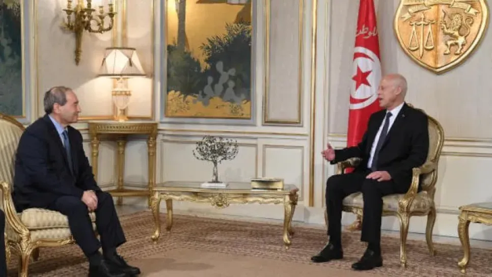 التقى وزير الخارجية السوري، فيصل المقداد، بمقر الخارجية التونسية اليوم، خلال الزيارة الرسمية التي يقوم بها إلى العاصمة تونس، مع وزير الخارجية التونسي، نبيل عمار. وعقب اللقاء، صدر بيان مشترك بعد جلسة مباحثات موسعة ضمت وفدي البلدين.وتضمن البيان السوري التونسي المشترك، تكثيف التواصل بين البلدين في المرحلة المقبلة بهدف تعزيز التشاور والتنسيق حول مختلف القضايا والمسائل الثنائية ذات الاهتمام المشترك، والعمل على عقد اللجنة المشتركة، واستئناف التعاون الاقتصادي بين البلدين ولاسيما في المجالات ذات الأولوية.وأضاف البيان: "تعزيز التعاون في المجال الأمني ولا سيما في مجال مكافحة الإرهاب والجريمة المنظمة و...