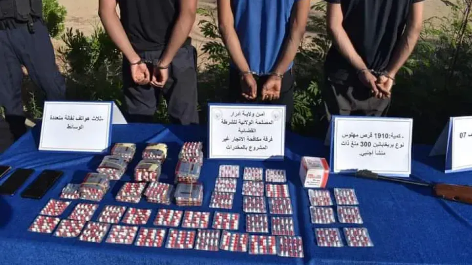 تمكنت قوات فرقة مكافحة الاتجار غير المشروع بالمخدرات التابعة للمصلحة الولائية للشرطة القضائية بأمن ولاية أدرار من تفكيك شبكة إجرامية وذالك بعد استغلالها لمعلومات وردت إليها من بعض الموطنين تفيد بتحركات لأشخاص مشبوهين في أحد الأحياء بالولاية، وبعد القيام بعملية شرطية محكمة تم توقيف ثلاثة أشخاص وحجز 1910 قرص مهلوس من نوع بريغابالين 300ملغ ذات منشأ أجنبي بالإضافة إلى حجز سلاح من الصنف السابع يتمثل في (بندقية) وثلاث هواتف نقالة.