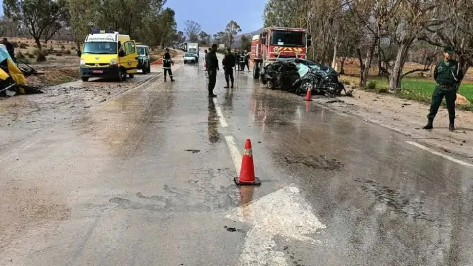توفي، اليوم، شخصان وأصيب 4 آخرون بجروح خطيرة، في حادث اصطدام بين سيارة أجرة وسيارة سياحية في منطقة شعبة الحجل بالطريق الوطني رقم 14 في شطره الرابط بين بلديتي عين الحديد وتخمارت.