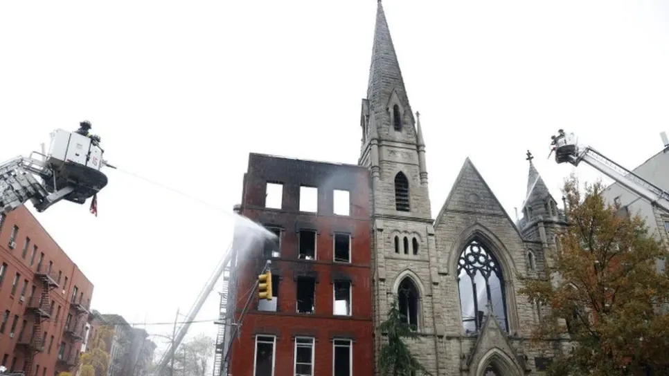 EPA الحريق نشب في مبنى خال مجاور للكنيسة وامتد إليها. شب حريق في كنيسة عمرها 128 عاما في مدينة نيويورك الأمريكية، ما تسبب في تدمير المحتويات الداخلية للكنيسة ونوافذها الزجاجية.بدأ الحريق فى ساعة مبكرة من صباح يوم السبت، فى مبنى خال بجوار كنيسة ميدل كوليجيت التاريخية الشهيرة.لم يتسبب الحريق في خسائر بشرية. لكن أربعة من رجال الإطفاء أصيبوا بجروح طفيفة حتى تمكنوا من إخماد النيران. وسارعت السلطات الأمريكية بفتح تحقيق لمعرفة أسباب اندلاع الحريق.ونقلت تقارير عن مساعد قائد هيئة الإطفاء جون هودجنز قوله: "ستكون إعادة بناء الكنيسة مهمة صعبة". EPA كنيس...