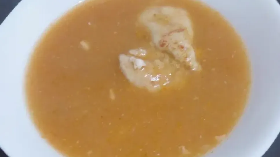 المقاديرصدر دجاج، 3حبات جزر، حبة بطاطا، لفت، القرعة الحمراء، جلبانة، كرافس، 2 طماطم، بصلة، كراث، 4 وريقات خس، زيت، ملح وفلفل أسود.التحضير نقلي الدجاج والبصل والبورو ونضيف باقي الخضر لتطهى ثم الطماطم والماء، وتترك لمدة 30 دقيقة، بعدما تنضج ننزع الدجاج ونطحن الخليط ونعيده فوق الفرن ليغلي مدة 5 دقائق.