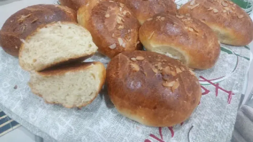 المقادير400 غ فرينة، علبة ياغورت طبيعي، ملعقة كبيرة جلجلان محمص، ملعقتان كبيرتان حليب جاف، ملح، بيضة، بياض بيض، 1/2 علبة ياغورت، زيت، ملعقة كبيرة زبدة طرية، ماء دافئ.لدهن الخبز: صفار بيضة، ملعقة صغيرة، قهوة، 1/4 ملعقة صغيرة زيت. التحضير نخلط جميع المقادير ماعدا الزبدة ونجمع بالماء، نعجن العجينة ثم نضيف الزبدة، نترك العجينة تختمر نشكل الخبز وندهن بصفار البيض ونتركه يختمر مرة ثانية، ندخل الخبز للفرن، مسخن مسابقا.