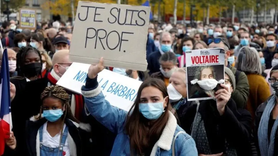 BBC داهمت قوات من الشرطة الفرنسية منازل العشرات من المشتبه في أنهم راديكاليون إسلاميون.جاءت هذه الخطوة على خلفية ذبْح مدرس كان قد عرض رسومًا كاريكاتورية مثيرة للجدل للنبي محمد على تلاميذه.ويُعتقد أن بعض من داهمت الشرطة منازلهم قد نشر رسائل دعْم لقاتل المدرس الفرنسي. وقالت الحكومة إنها تجري تحقيقات مع 51 من جمعيات المسلمين في فرنسا.وكانت عناصر من الشرطة لاحقت المشتبه به في قتل المدرس الفرنسي وأطلقت عليه الرصاص فأردته قتيلا يوم الجمعة. Reuters وقال وزير الداخلية جيرالد دارمانين، اليوم الاثنين، إن إجراءات الشرطة بعثت رسالة مفادها "لا هوادة...