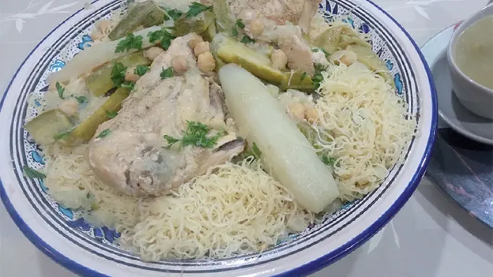 المقاديركيلو رشتة، قطع دجاج، حبة بصلة كبيرة، فلفل أسود، عود قرفة، ملح، زيت، حمص، لفت، كوسة.التحضير نضع في قدر الدجاج، نفرم البصل، الملح، الفلفل الأسود والقرفة ثم نتركها على النار مدة 5 دقائق، ثم نضيف الحمص ونمرقها بماء ساخن. وبعد ربع ساعة، نضيف للمرق اللفت.نضع الرشتة في كسكاس، نضيف لها ثلاث ملاعق كبيرة زيت، ونقوم بفتحها ونتركها لتطهى على البخار، ثم نقوم برشها بالماء ونضيف لها الملح ونعيدها لتطهى على البخار مرتين أو ثلاث على طريقة الكسكسي، وفي الأخير نضعها في صحن كبير ونضيف لها ملعقتين كبيرتين زبدة، ونظيف لها المرق، ونزينها باللفت والكوسة.