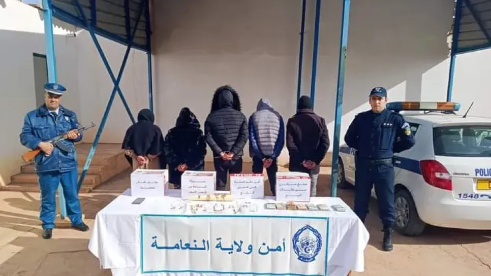 النعامةتمكن عناصر الأمن الحضري الرابع بأمن دائرة المشرية شمالي النعامة تمديد الاختصاص لإحدى الولايات بغرب الوطن القبض عصابة مكونة خمسة أشخاص مشتبه فيهم.
