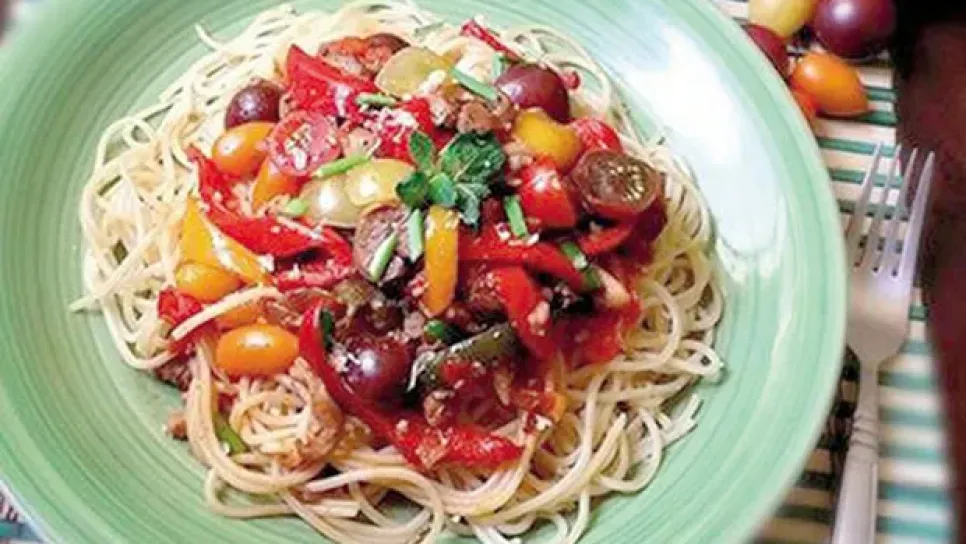 المقادير: 2 صدر دجاح مقطع قطعا صغيرة، علبة سباغيتي، 5 حبات طماطم، ملعقة كبيرة صلصة طماطم، كأس فطر مقطع شرائح، حبتا بصل مقطعة شرائح، كأس فلفل حلو مقطع شرائح، 3 فصوص ثوم مفروم، ربع ملعقة صغيرة ملح، نصف ملعقة صغيرة نعناع جاف، عصير حبة ليمون، ملعقتان كبيرتان زيت أو زبدة، ملعقتان كبيرتان جبنة بارميزان (للزينة). طريقة التحضير:تسلق السباغيتي بماء مملح وتصفى وتترك جانبا.نضع الزيت على النار ونحمر فيه البصل حتى يصبح شفافا ثم نضيف الثوم والفطر ونقلبها جيدا حتى تأخذ لوناً ذهبياً.نضيف قطع الدجاج المغسولة ونقلب على نار عالية خمس دقائق ثم يضاف لها الملح والفلفل والتوابل وعصير الليمونة وملعقة الصلصة والطماطم...