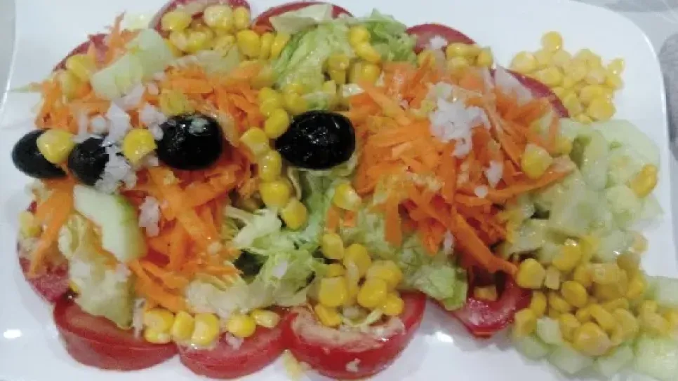 المقاديررأس خس، حبة طماطم، حبة جزر كمية زيتون أسود، ملح، زيت زيتون أو زيت نباتى، عصير الحامض، ذرة، ملعقة صغيرة خردل .طريقة التحضيرنغسل الخيار، الجزر والخس ونتركهم يجفون، نقطّع الخس، نبشر الجزر، نقطع الخيار بعد نزع الزريعة منه، نقطع الطماطم. في صحن التقديم نوزّع الخس ونزيّن بالطماطم، الخيار، الجزر المبشور، الذرة والزيتون الأسود.الصلصة نخلط الملح وزيت الزيتون وعصير الحامض والخردل ونوزّع الصلصة على السلطة من فوق.