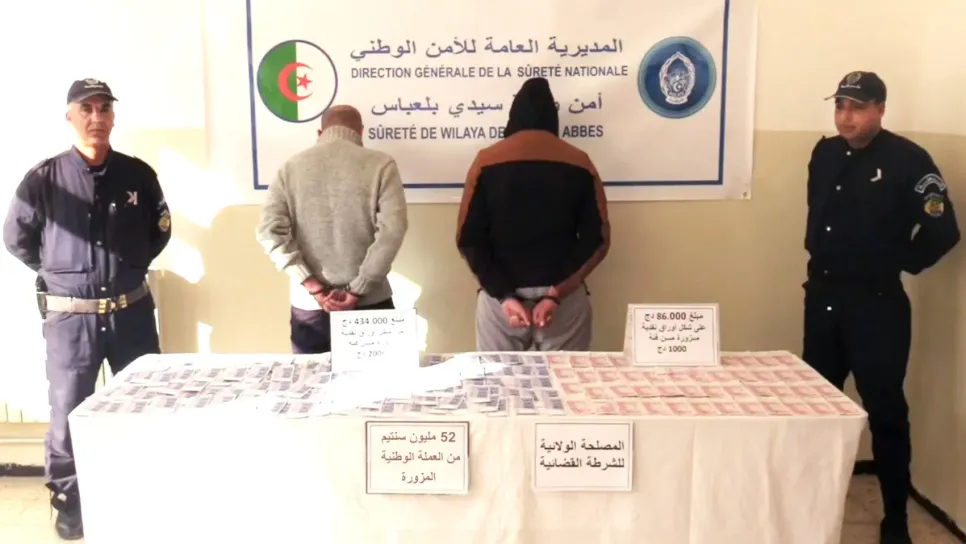 نجحت قوات الشرطة بأمن ولاية سيدي بلعباس خلال الساعات القليلة الماضية في توقيف شخصين وحجز ما يعادل الـ52 مليون سنتيم من العملة الوطنية المزورة وذلك بعد تحريات دقيقة كانت قد بوشرت على خلفية ورود معلومات عن جاهزية شخصين لإغراق السوق الوطنية بهذا النوع من العملة المغشوشة من فئة ألف وألفي دينار جزائري. وكانت التحقيقات قد أكدت انتماء الشابين إلى شبكة إجرامية مختصة في المجال، مع الإشارة إلى تقديم المعنيين أمام النيابة المختصة إقليميا بعد استكمال الإجراءات القانونية عن قضية تكوين جمعية أشرار للإعداد لجناية تزوير أوراق نقدية ذات سعر قانوني.