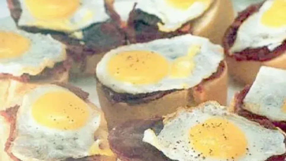 المقادير:12 شريحة من الخبز العادي، 12 بيضة صغيرة الحجم، 12 شريحة من اللحم المرحي، زبدة طرية لدهن الخبز، ملعقة كبيرة زيت لدهن المقلاة، 500 غرام لحم مرحي، ملح، فلفل أسود. التحضير:في وعاء نضع اللحم المرحي، ملح، فلفل أسود ونخلط ثم نضع كويرات ونبسطها على شكل شريحة دائرية، ثم ندهن الخبز من الأعلى بالزبدة، ثم ندهن مقلاة غير لاصقة بقليل من الزيت، ثم نقلي شرائح اللحم المرحي.نكمل في المقلاة مع قلي البيضة واحدة تلو الأخرى، ثم نضع شرائح اللحم المفروم فوق شرائح الخبز، ثم نضع البيض المقلي من الفوق.في فرن مسخن مسبقا، نسخن شرائح الخبز قليلا ثم نضعها فوق طبق التقديم وتؤكل ساخنة.