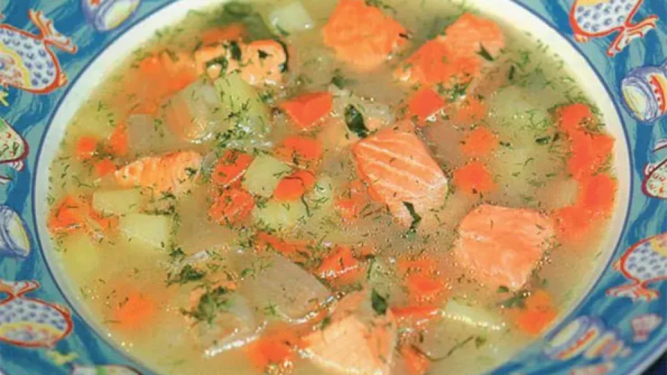 المقادير 500  غ سمك سلمون مقطع إلى مكعبات منزوعة الجلد والعظام، 1 حبة بصل متوسطة مقطعة إلى مربعات صغيرة، 2 سنينات ثوم مدروسة، حبة بطاطا متوسطة مقطعة إلى مكعبات صغيرة، 2 ملعقة كبيرة  زيت زيتون، 6 كيسان مرق سمك أو دجاج، ملح، فلفل أكحل، 1ملعقة كبيرة معدنوس مقطعة تقطيعا رقيقا جدا.التحضير نسخن الزيت في قدر على نار متوسطة ثم نضع البصل والثوم ونحمّسه لمدة 3 د، نضيف البطاطا والجزر ونحرك لمدة 5 د، ثم نضيف المرق ونترك الكل يغلي، عند البدء في الغليان ننقص الحرارة ونتركه لمدة 15 د. نضيف سمك السلمون والملح والفلفل الأكحل ونترك الكل لمدة 10 د، ونقدم الأكلة مزينة بالمعدنوس الرقيق.