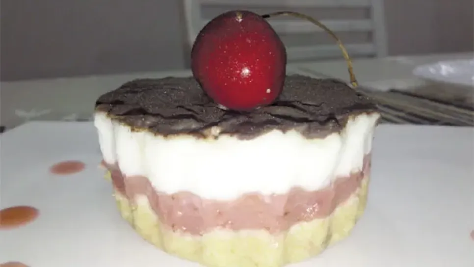 المقادير1 كمية من صابلى مرحي ”بسكويت”، زبده ذائبة. الطبقة الأولى: كمية من معجون الفراولة، نشاء. الطبقة الثانية: كوب حليب، 02 م ك نشاء، 04 م ك مبشور جوز الهند، 4 م ك سكر. التحضيرنحضر قوالب صغيرة ونضع ورقا شفافا، نطحن البسكويت مع بعض ونضيف الزبدة، نضع طبقة البسكويت ونبسطها جيدا نتركها في الثلاجة 10 د. نضع فى القدر فراولة ونشاء على النار حتى تعقد، نسكب الخليط على طبقة البسكويت ونتركه فى الثلاجة 20 د. نخلط الحليب والسكر ومبشور جوز الهند على النار حتى يعقد ونضعه على طبقة الفراولة ونعيده ثانية إلى الثلاجة. عند التقديم نزيّنها بالشكولاطة والكرز أو حسب رغ...