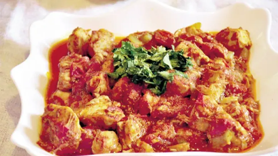 المقادير:صدر دجاج مقطع إلى مكعبات، زيت، رأس ثوم مدروس، ملح، فلفل أبيض، كروية، راس الحانوت، ملعقة كبيرة طماطم مصبرة، 2 حبات طماطم مقطعة إلى مكعبات صغيرة، 2 رأس فلفل حار مقطع رقيق، حشيش للتزيين.التحضير:نحضر كل المقادير اللازمة في مقلاة، نضع الزيت يسخن ثم نضيف صدر الدجاج المقطع إلى مكعبات صغيرة، ونتركه “يتحمس” جيدا مع ملح وفلفل أبيض.من جهة أخرى، وفي صحن نضع الثوم وطماطم مقطعة إلى مكعبات صغيرة والحار ثم نضيف الكروية وراس الحانوت، وفي الأخير نذوب الطماطم المصبرة المحللة في قليل من الماء.بعدها “نحمس” الدجاج ونضيف الخليط المحضر في الصحن، ونتركه “يتجمر” على نار قليل...