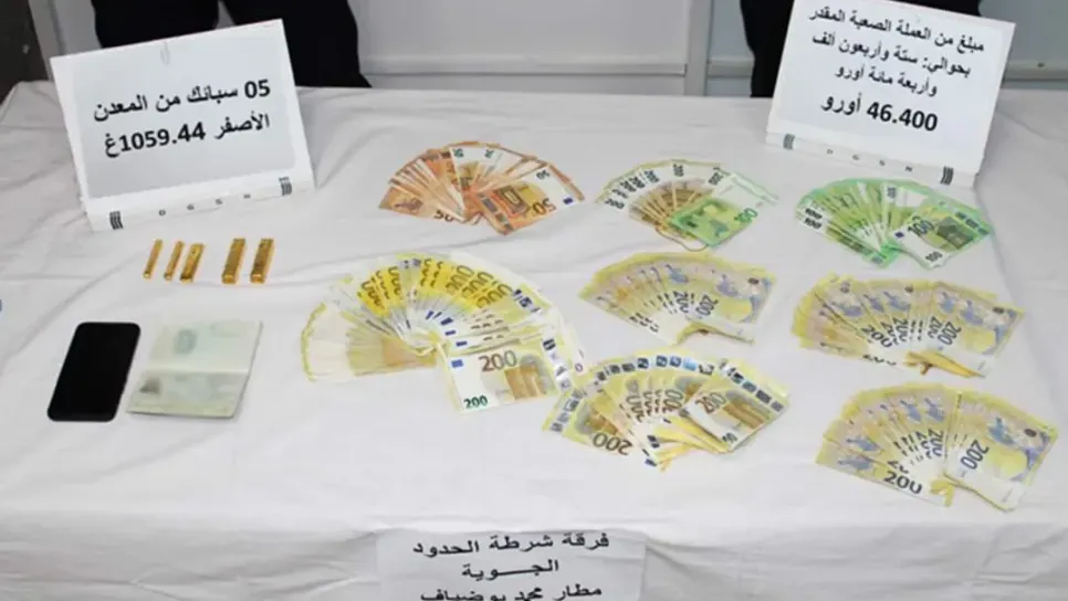 تمكنت مصالح شرطة الحدود بمطار قسنطينة، من توقيف امرأة وضبط بحوزتها مبالغ من العملة الصعبة وسبائك من الذهب. وحسب بيان للشرطة الجزائرية، فقد تم حجز إثر هذه العملية 46400 أورو و5 سبائك من المعدن الأصفر بوزن 1,36 كلغ.