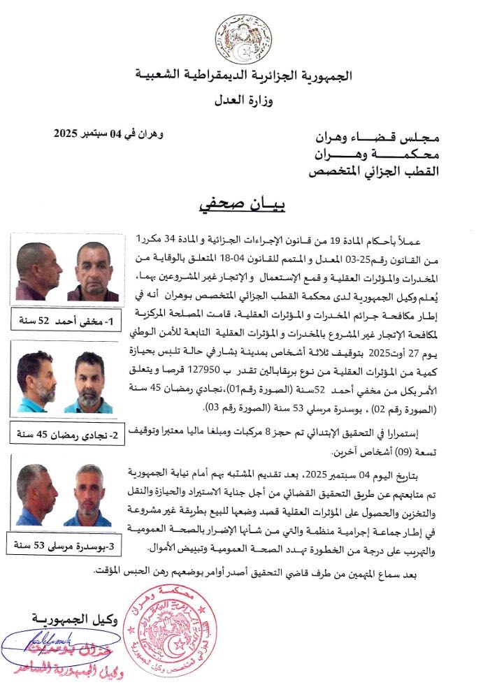 جاء في البيان: أنه "عملاً بأحكام المادة 19 من قانون الإجـراءات الجـزائية والمادة 34 مكرر1 من القانون رقم25-03 المعدل والمتمم للقانون 04-18 المتعلق بالوقاية من المخدرات والمؤثرات العقلية وقمع الإستعمال والإتجار غير المشروعين بهما، يُعــلم وكيل الجمهورية لدى محكمة القطب الجزائي المتخصص بوهران أنه في إطار مكافحة جرائم المخدرات والمؤثرات العقلية، قامت المصلحة المركزية لمكافحة الإتجار غير المشروع بالمخدرات و المؤثرات العقلية التابعة للأمن الوطني يوم 27 أوت 2025 بتوقيف ثلاثة أشخاص بمدينة بشار في حالة تلبس بحيازة كمية من المؤثرات العقلية من نوع بريقابالين تقدر بـ 127950 قرصا".