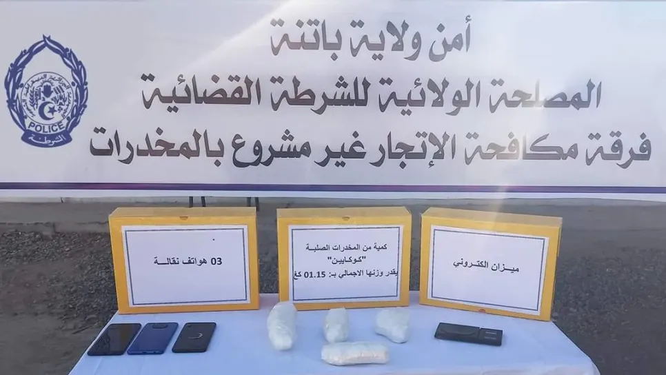 تمكنت فرقة مكافحة الاتجار غير مشروع بالمخدرات بأمن ولاية باتنة ، من توقف 06 أشخاص و حجز كمية من المخدرات الصلبة وأوضح بيان لذات المصالح ، أنه تم توقيف ستة أشخاص وحجز 01 كلغ و 15 غ من المخدرات الصلبة (كوكايين)‎.و3هواتف نقالة وميزان الكتروني .