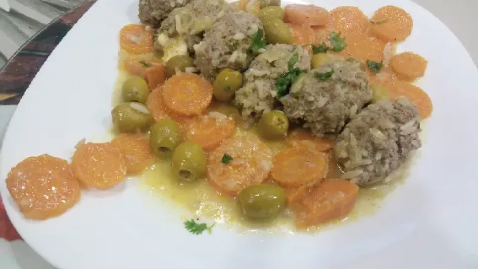 المقاديرلحم مفروم، 2 م ك أرز مغلي، حبة بصل، صفار حبة بيض، زيتون منزوع النوى، جزر، معدنوس، ملح، فلفل أسود.التحضير نضع في قدر بالصل المفروم، الزيت والزبدة، ملح وفلفل أسود ونضيف الجزر المقطع ونمرق بالماء. نخلط اللحم المفروم + أرز مغلي + معدنوس مقطع + صفار بيضة + ملح وفلفل أسود.نعمل كويرات ونضيفها للقدر وتترك تطهى. نضيف الزيتون المنقوع ليلة كاملة في الماء، ونصفي علبة الفطر ونضيفه للقدر ونطفئ النار ثم نضع المعدونس.