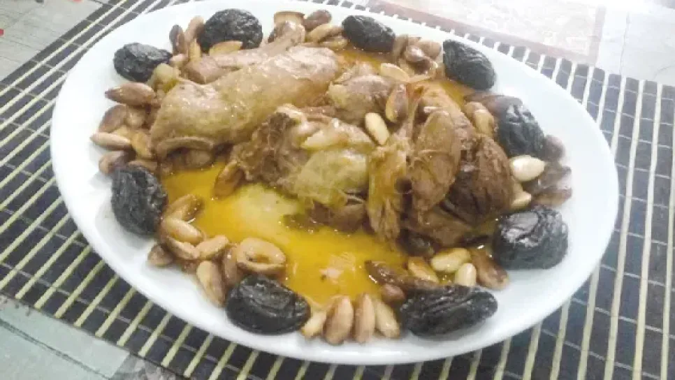 المقاديرقطع من لحم غنمي، بصل، ملح، فلفل أسود، زيت، قليل من القرفة، برقوق جاف، لوز مقلي للتزيين. التحضير يوضع اللحم في قدر، ثم يضاف إليه الزيت والبصل الذي لا يتم تقطيعه، البهارات (التوابل) والملح والقرفة، ويحرك الكل جيدا ثم يوضع الكل على النار ونضيف القليل من الماء حتى لا تحترق البهارات، لمدة 6 دقائق .بعد ذلك نضيف الماء الساخن، ونقلل من النار ونترك اللحم حتى ينضج .من جهة أخرى يفور البرقوق.وعند نضج الطبق ننزع البصل. يوضع اللحم في طبق التقديم، ونضيف إليه البرقوق ونزينه بقطع اللوز المقلي.