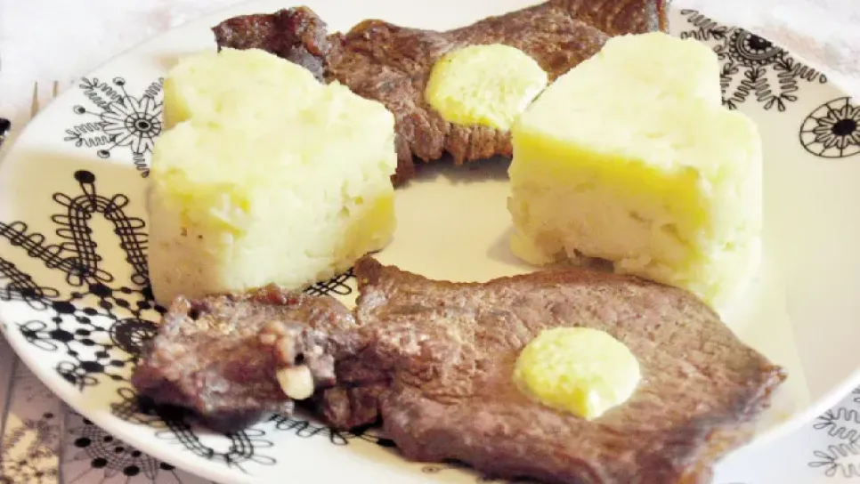 المقادير:1 كلغ بطاطا، 50 غ زبدة، كأس حليب دافئ، شرائح اللحم، ملح، فلفل أكحل، زيت زيتون، كبابة مركبة، الصلصة البيضاء، سكنجبير، موتارد، توم مدروس.التحضير:حضري كل المكونات اللازمة، نغسل البطاطا جيدا ثم نقطعها على أربع ونغليها في ماء مملح داخل قدر الضغط مدة 15 د، بعد طهي البطاطا نقشرها ونرحيها يدويا ونضيف الحليب والزبدة ونخلط جيدا. كيفية تحضير شرمولة شرائح اللحم:نخلط 3 سنينات ثوم مدروسة، ملح، فلفل أكحل، سكنجبير، ملعقة كبيرة موتارد + زيت زيتون نقوم بطلي شرائح اللحم بالشرمولة المحضرة، ثم نغطيها ونتركها ترتاح في الثلاجة على الأقل من ساعة إلى ساعتين ثم نقلبها.كيفية تحضير الصلصة البيضاء:نقوم...