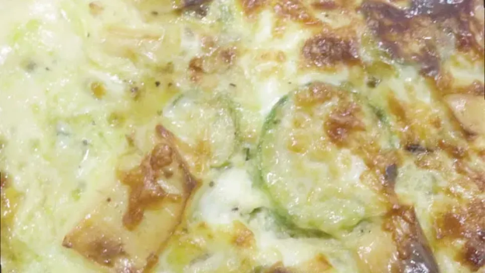 المقادير 500 غ كوسة مقطعة دوائر، حبة بصل مفرومة، 2 حبة بيض، 300 ملل حليب، 2 ملعقة صغيرة خميرة حلوى،1 ملعقة صغيرة ملح، 1 ملعقة صغيرة فلفل أسود، 200 غ جبنة مفرومة، 1 ملعقة كبيرة زبدة. التحضير * نطبخ الكوسا فى القدر مع م/ ك زيت ثم نضيف البصل ونحرك من حين لآخر. من جهة أخرى، يخفق البيض ويضاف الحليب، الملح، خميرة الحلوى وكمية من الجبنة ورشة فلفل أسود ويخلط المزيج.تدهن صينية الفرن وترص فيها الكوسا، يسكب عليها مزيج البيض وترش بالكمية المتبقية من الجبنة والخبز المرحي وقليل من الزبدة. تدخل الصينية في فرن مسخن مسبقا ما بين 20 إلى 30 دقيقة أو حسب نوع الفرن وحجم الصينية إلى أن يتماسك المزيج ويكتس...