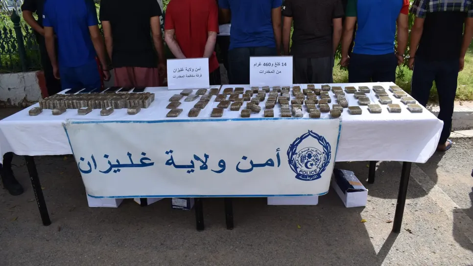 أفادت شرطة دائرة جديوية، بأمن ولاية غليزان في بيان لها، بتوقيف شخصين، وحجز صفيحتين من المخدرات، وسيف من الحجم الكبير. وهذا على إثر نصب نقطة مراقبة أمنية، على مستوى المدخل الغربي للمدينة، حيث تم توقيف سيارة أجرة قادمة من إحدى الولايات المجاورة. وبعد إخضاع أحد ركابها للتفتيش، تم ضبط كمية من راتنج القنب الهندي، على شكل صفيحتين، كانت مخبأة بإحكام داخل قميص بين كرسي وهيكل السيارة، بالإضافة إلى مبلغ مالي قدره 7500 دينار جزائري من عائدات الترويج. وبالتنسيق مع النيابة المختصة، تم تفتيش مسكنه أين تم حجز سلاح أبيض محظور(سيف حديدي من الحجم الكبير)،وسكين متوسط الحجم يستعمل في عملية تقطيع وتهيئة المخدرات...