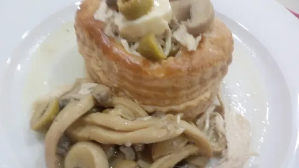 المقاديرشرائح دجاج مقطعة، علبة فطر، حبة بصل، 150 غ زيتون دون النوى مقطع، ملح، فلفل أسود، 02 م ك زيت، ماء.التحضير نضع فى قدر بصل مفروم وزيت يتقلى، ثم نضع الدجاج، نضيف الزيتون، الملح، الفلفل الأسود ونخلط ثم نضيف الماء ونتركه يواصل النضج. من جهة أخرى، نقلي الفطر مع الزبدة وشرائح البصل، عند طهي الدجاج نخلطه مع الفطر. نسخن ”الفول أو فون” قليلا في الفرن، ونضعه في صحن التقديم ونزيّنه بالصلصة.