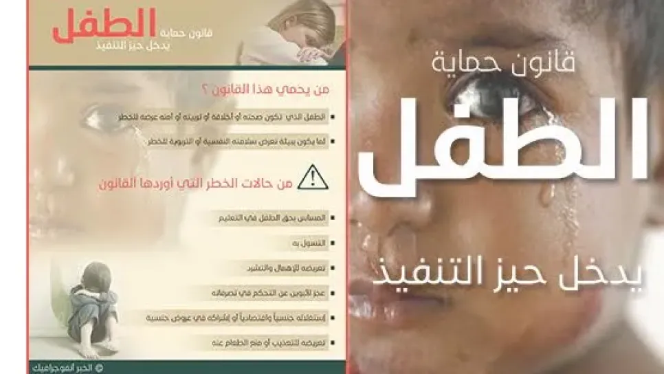 دخل قانون حماية الطفل حيز التنفيذ، بعد صدوره في الجريدة الرسمية، أمس، محددا أنه يحمي الطفل الذي تكون صحته أو أخلاقه أو تربيته أو أمنه عرضة للخطر، أو يكون في بيئة تعرض سلامته النفسية أو التربوية للخطر. ومن حالات الخطر التي أوردها القانون، المساس بحق الطفل في التعليم، التسول به، تعريضه للإهمال والتشرد، عجز الأبوين عن التحكم في تصرفاته، بالإضافة إلى استغلاله جنسيا واقتصاديا، أو إشراكه في عروض جنسية، تعريضه للتعذيب أو منع الطعام عنه. وتتراوح العقوبات في قانون حماية الطفل، من سنة إلى 3 سنوات سجنا، وبغرامة تصل إلى 300 ألف دينار لكل من أقدم على الأفعال المذكورة.