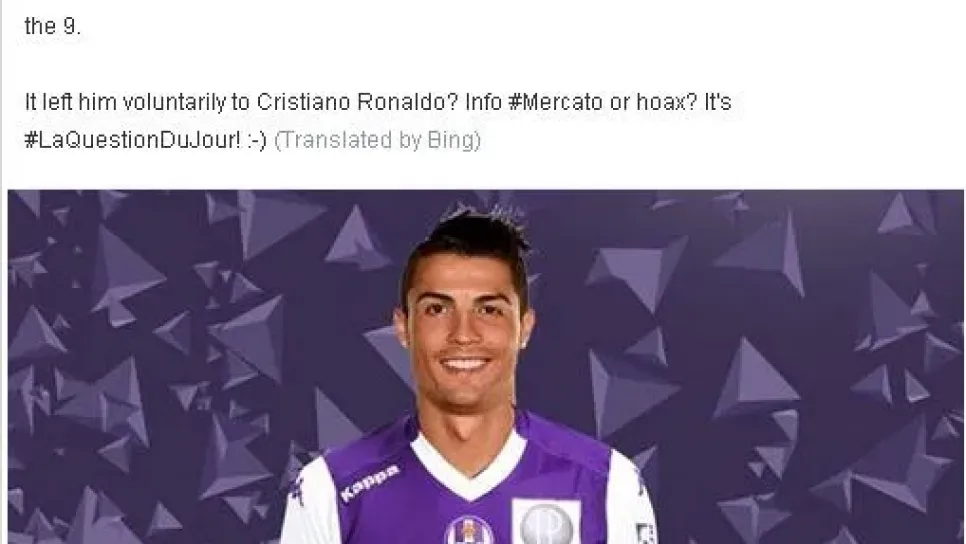 نشر الموقع الرسمي لنادي تولوز الفرنسي على صفحته الخاصة على موقع التواصل الاجتماعي فيسبوك صورة لنجم نادي ريال مدريد البرتغالي كريستيانو رونالدو ronaldo بقميص الفريق الفرنسي الذي يتواجد في منتصف ترتيب الليغ 1. واشار تولوز الى ان الرقم 7 في الفريق اصبح حر بعد ان قرر اللاعب مارتن برايسوايت ان يحمل الرقم 9 ليتساءل الفريق عن افضل لاعب قادر على حمل هذا الرقم.