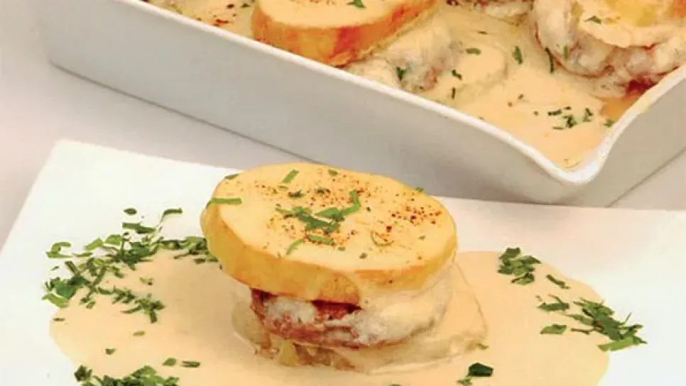 المقادير 1 كلغ لحم مرحي، 3 حبات بطاطا مقشرة وكبيرة، 1 بصل كبيرة ومهشمة، 4 سنينات ثوم مدروسة، زيت للقلي، 2 ملعقة كبيرة معدنوس مقطعة تقطيعا رقيقا جدا، ملح، فلفل أبيض،1ملعقة صغيرة قرفة،1ملعقة صغيرة قرنفل مرحي،1ملعقة صغيرة هيل مرحي ، 1ملعقة صغيرة جوزة الطيب، 1ملعقة كبيرة زيت الزيتون، كأس فرينة، ½ ماء دافئ،4 ملعقة كبيرة ليمون، 2ملعقة كبيرة زبدة،1ملعقة صغيرة فلفل أحمر.التحضير نقطع البطاطا إلى دوائر ونقليها في زيت ساخنة لمدة 5 د تصبح ذهبية، ثم نضعها في ورق مصاص، نخلط اللحم المرحي مع البصل والثوم والملح والفلفل الأكحل، قرفة، قرنفل، جوزة الطيب، الهيل، نصنع كويرات متسا...