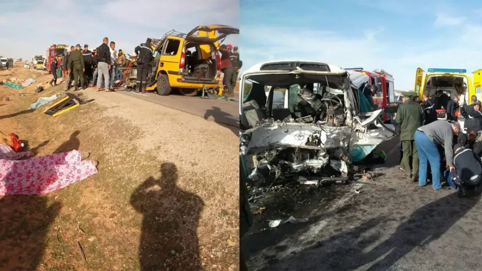 أدى حادث مرور مأساوي اليوم الخميس بولاية سعيدة إلى مقتل 15 شخصا وإصابة 20 آخرين بجروح متفاوتة. وحسب بيان لمصالح الحماية المدنية فإن الحادث وقع على الساعة 15 و 20 دقيقة بين حافلة صغيرة لنقل المسافرين وسيارة أجرة بالطريق الوطني رقم 6، بالمكان المسمى سفيد ببلدية سيد أحمد، دائرة عين الحجر. وتم تحويل القتلى والجرحى إلى مستشفى أحمد مداغري واستعجالات السعيدة وكذا المركز الاستشفائي لعين لحجر، يضيف نفس البيان.