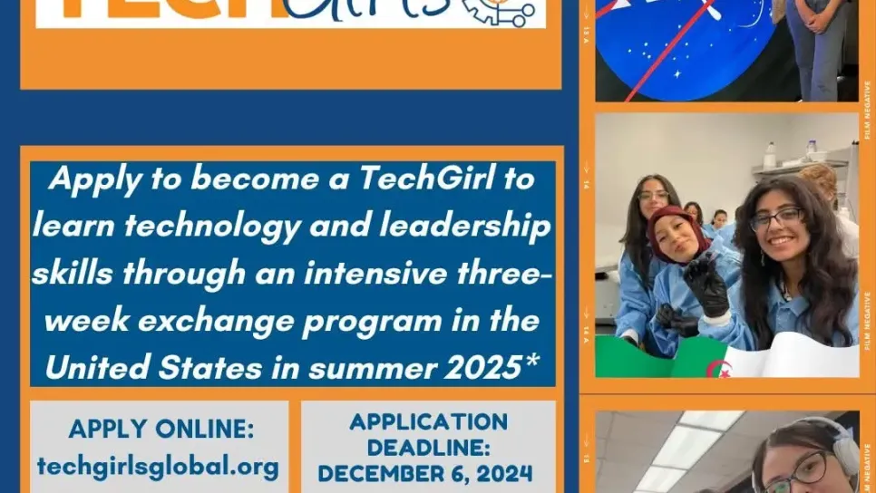 ذكرت السفارة الأمريكية لدى الجزائر، اليوم الأحد، أن موعد انتهاء تقديم طلب المشاركة في برنامج TechGirls للحصول على منحة دراسية، سيكون يوم 6 ديسمبر المقبل. وجاء في بيان السفارة، عبر حسابها على "الفايسبوك"، "تقدموا بطلبكم للمشاركة في برنامج TechGirls قبل يوم 6 ديسمبر 2024، للحصول على منحة دراسية كاملة لبرنامج التكنولوجيا الصيفي لمدة 3 أسابيع في الولايات المتحدة، للفتيات اللاتي تتراوح أعمارهن بين 15 و17 عاما". ودعت السفارة المهتمات بطلب المنحة التقدم بطلب "للانضمام إلى مجتمع من الشابات اللاتي يغيرن عالم العلوم والتكنولوجيا والهندسة والرياضيات"، ويمكن التسجيل على الرابط التالي: techgirlsgl...