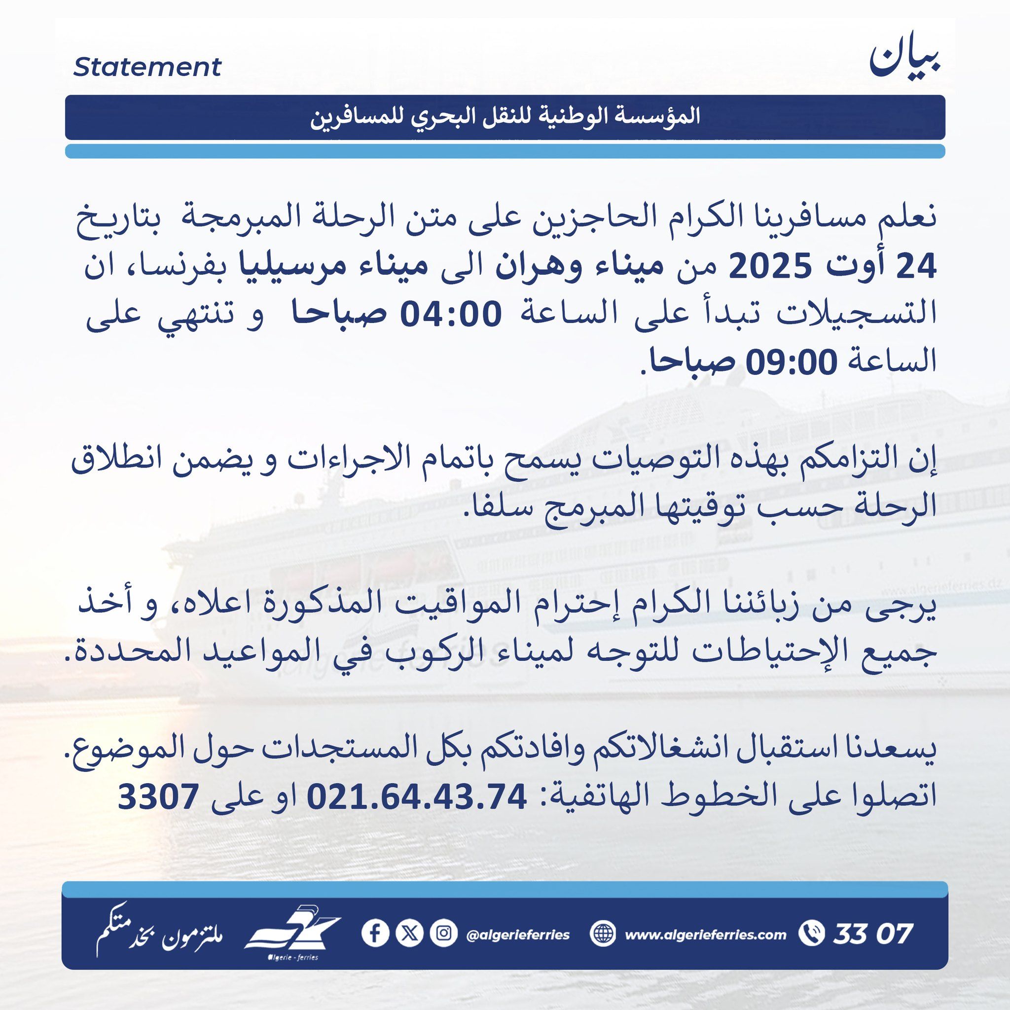 أفادت المؤسسة الوطنية للنقل البحري للمسافرين، بأن التسجيلات الخاصة بالرحلة المُبرمجة بتاريخ 24 أوت 2025 من ميناء وهران إلى ميناء مرسيليا بفرنسا، تبدأ على الساعة 04:00 صباحا وتنتهي على الساعة 09:00 صباحا.