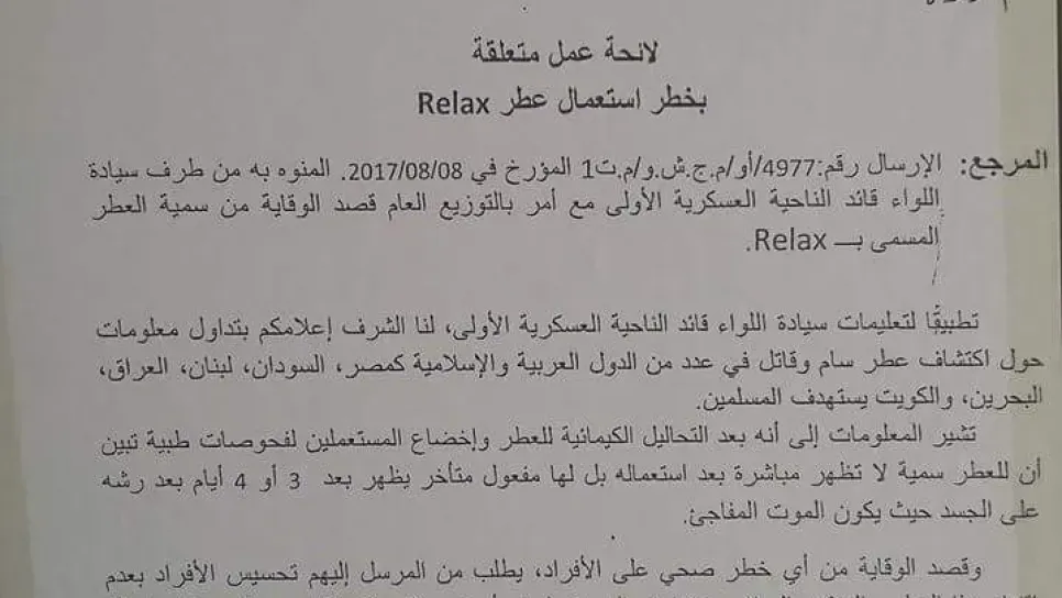 حذرت وزارة الدفاع الوطني تداول عطر موسوم بـ"رولاكس" يؤدي الموت المفاجئ فترة مباشرة ومتأخرة استعماله .  وحسب نص ارسالية عسكرية تم تسريبها موجهة.