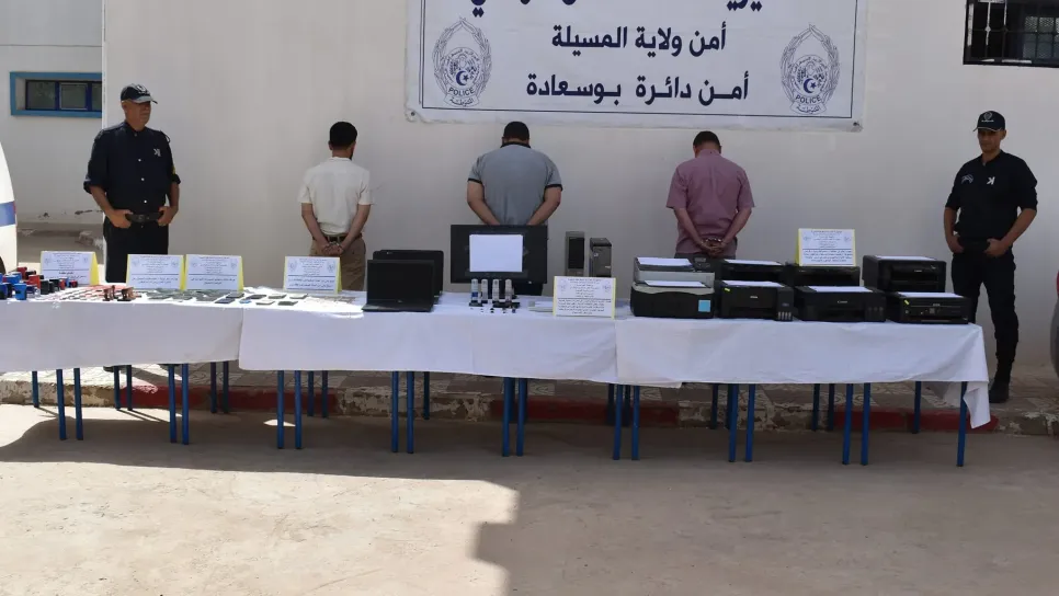 تمكن عناصر الشرطة بأمن دائرة بوسعادة التابعة لأمن ولاية المسيلة، خلال هذا الأسبوع، من وضع حد لنشاط شبكة إجرامية تتكون من ثلاثة اشخاص أشخاص، يحترفون تزوير المحررات الرسمية والوثائق الإدارية، مع إسترجاع أختام مقلدة لمؤسسات عمومية وخاصة وتجهيزات الإعلام الآلي المستعملة في عمليات التزوير. قضية الحال تمت على إثر اكتشاف ذات العناصر لحالات تزوير لوثائق رسمية تحمل أختام مقلدة لمؤسسات عمومية وخاصة، ليتم بعد ذلك مباشرة التحقيق في القضية تحت إشراف النيابة المختصة إقليميا، أسفر حسب بيان خلية الاتصال والعلاقات العامة عن توقيف المشتبه فيهم وضبط محجوزات مختلفة 100ختم مقلد...