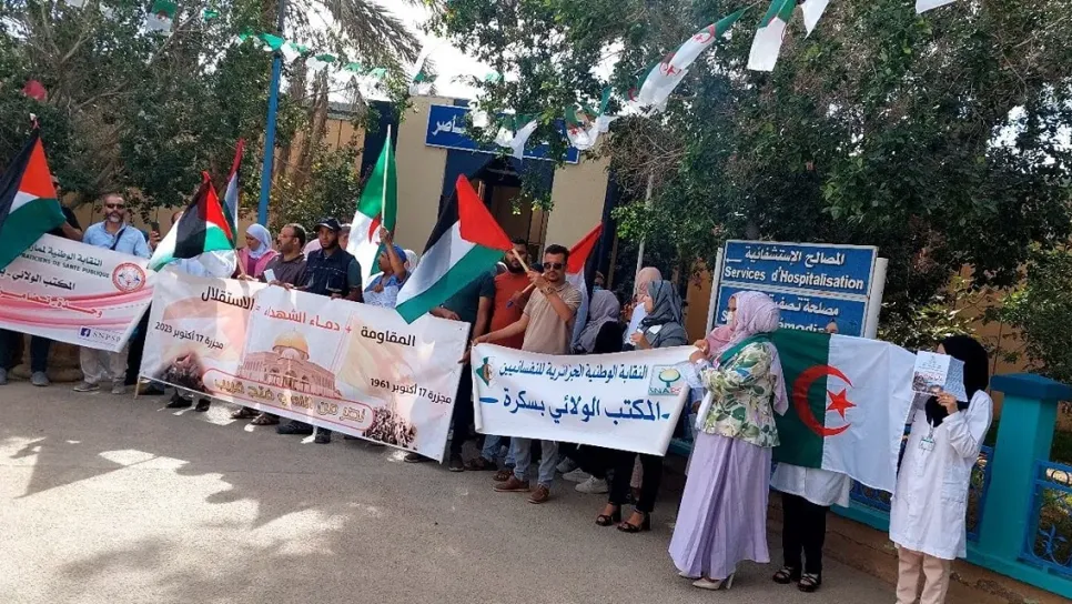 نظم ائتلاف نقابات الصحة الجزائرية لدعم ونصرة فلسطين، اليوم الثلاثاء بالمركز الاستشفائي الجامعي "مصطفى باشا" بالجزائر العاصمة، وقفة تضامنية الشعب الفلسطيني يتعرض له.