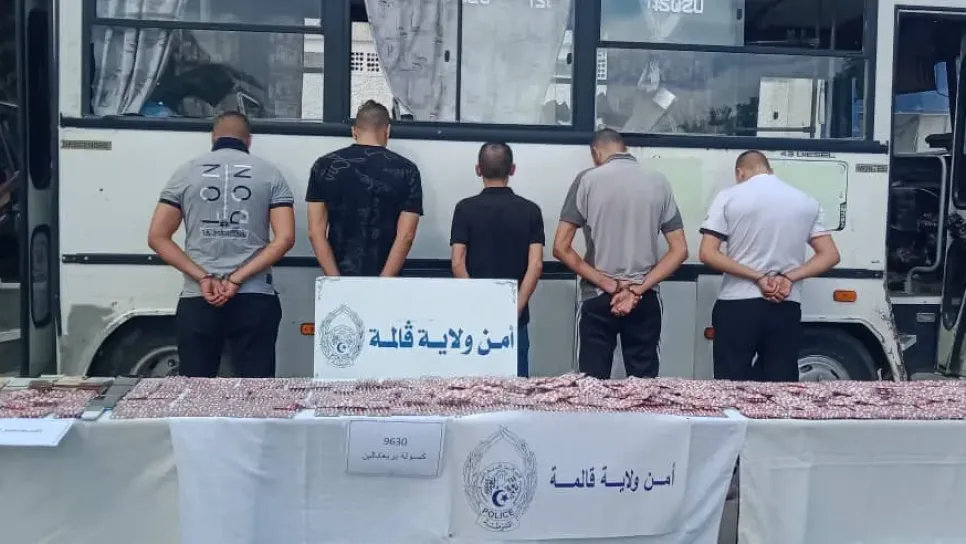 وضعت قوات الشرطة القضائية لفرقة مكافحة المخدرات بأمن ولاية ڨالمة، في عمليتين منفصلتين، حدا لنشاط خمسة أشخاص، يروجون المؤثرات العقلية بطريقة غير مشروعة، وحجز ما لا يقل عن 12150 كبسولة من المؤثرات العقلية. القضية الأولى، تتعلق بجماعة إجرامية منظمة، تنشط في مجال تهريب المؤثرات العقلية، باستعمال حافلة للنقل الحضري للمسافرين. وقد أطاحت قوات فرقة مكافحة المخدرات لأمن ولاية ڨالمة برؤوسها الأربعة البالغ أعمارهم بين 35سنة و43 سنة، بعد خطة عملياتية محكمة التنسيق، على مستوى مدخل بلدية بن جراح، حيث تم حجز كمية من المؤثرات العقلية قدرت بما لا يقل عن 9630 كبسولة مؤثرات عقلية، التي كانت مخبأة خلف واقيي الصد...