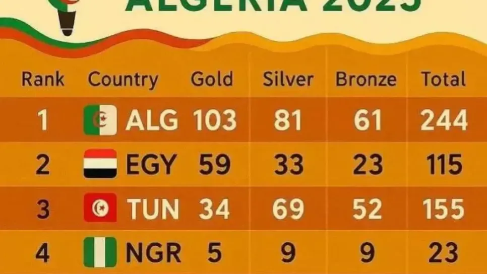 توجت الجزائر بلقب النسخة الأولى من الألعاب الإفريقية المدرسية - 2025، التي استضافتها مدن عنابة، قسنطينة، سطيف وسكيكدة، في الفترة من 26 جويلية إلى 5 أوت، وتصدرت جدول الترتيب النهائي للميداليات بعد تسعة أيام من المنافسة، بإجمالي 245 ميدالية، منها 103 ذهبية، 80 فضية و61 برونزية.
