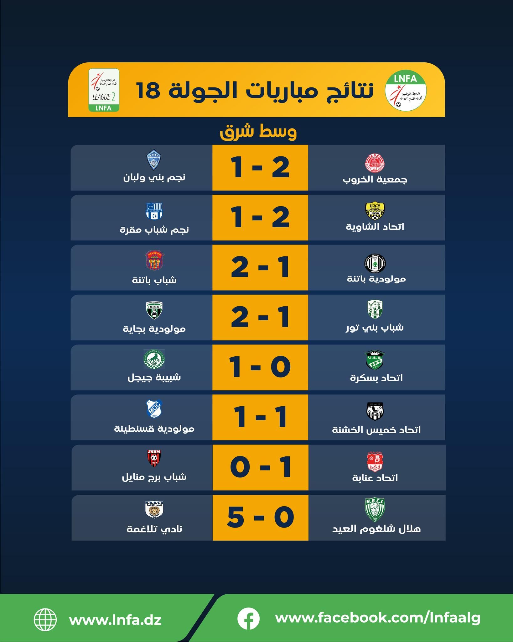 أُجريت، اليوم السبت، مقابلات الجولة الـ 18 من بطولة الرابطة الثانية هواة في مجموعتيها، حيث بقيت الأوضاع على حالها في مقدمة مجموعة وسط-غرب فيما تقلص الفارق عن الرائد في مجموعة وسط-شرق.