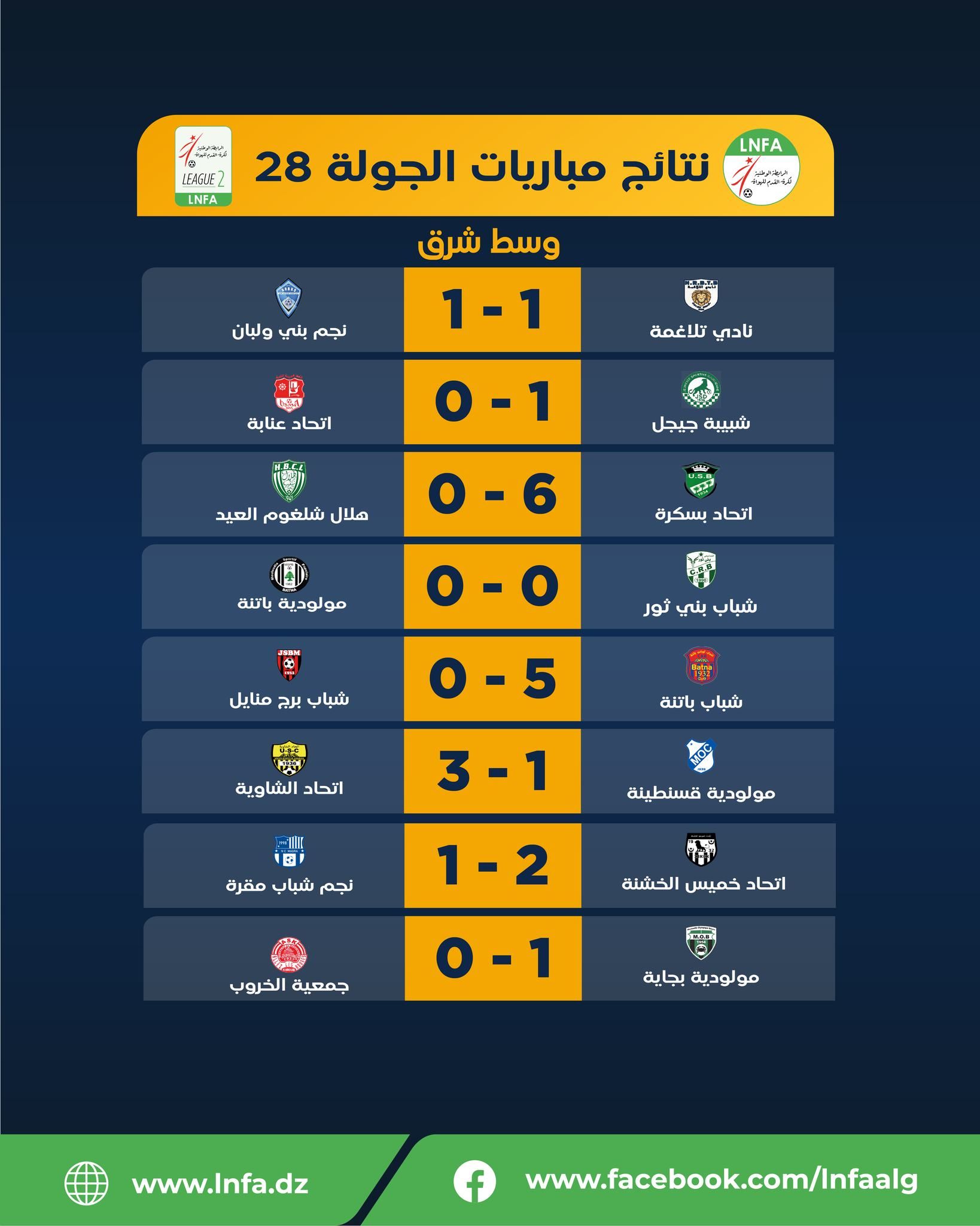 لم تحدث الجولة الـ 28 من بطولة الرابطة الثانية هواة (مجموعة وسط-شرق)، التي جرت اليوم الثلاثاء، أي تغيير في مقدمة الترتيب، بعد تحقيق فرق الصدارة الخمس الأولى انتصارات جماعية.
