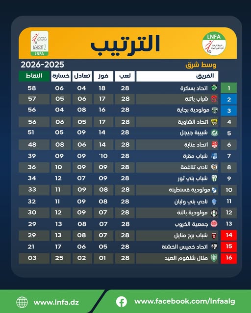 وبقي الترتيب على حاله، حيث يتصدر اتحاد بسكرة بـ 58 نقطة، يليه شباب باتنة بـ 57 نقطة. كما يتقاسم المركز الثالث كل من اتحاد الشاوية ومولودية بجاية بـ 56 نقطة لكل منهما، بعدما عاد الأول بفوز ثمين من قسنطينة أما المولودية المحلية 3-1، في حين حقق "الموب" انتصارا صعبا أمام جمعية الخروب (1-0).