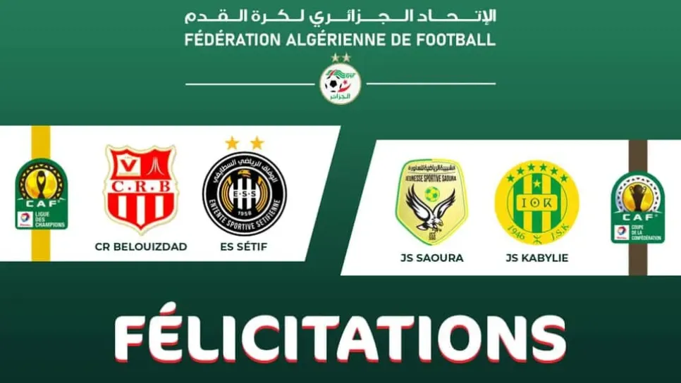 هنأ اليوم الإثنين، الاتحاد الجزائري لكرة القدم، برئاسة شرف الدين عمارة الأندية الجزائرية التي تأهلت إلى الدورين القادمين من كأسي الكنفيدرالية الإفريقية ورابطة أبطال إفريقيا، ونجحت فرق كل من شبيبة الساورة، شبيبة القبائل، شباب بلوزداد ووفاق سطيف في التأهل إلى الدور المقبل من المنافستين القاريتين.
