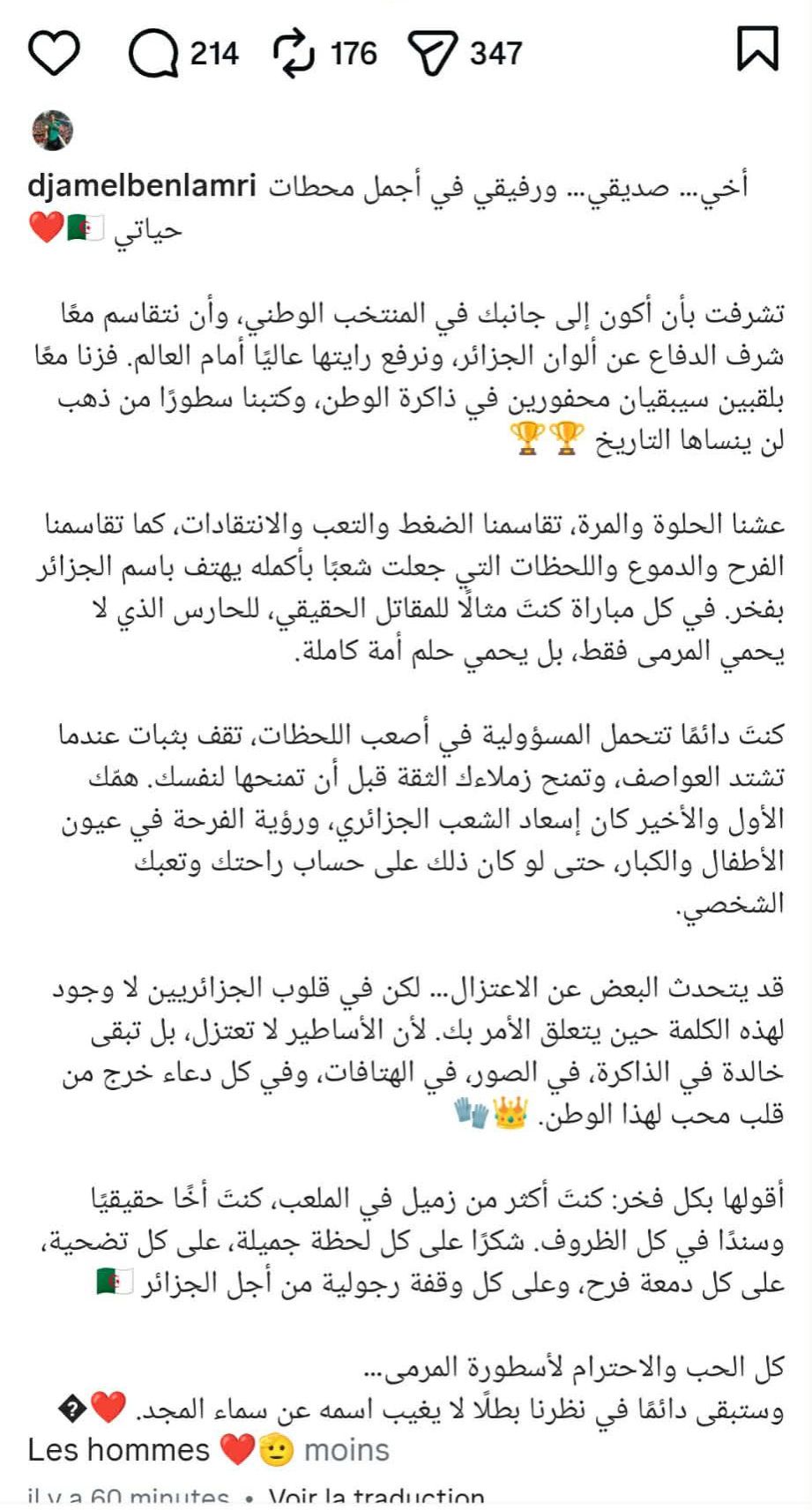 ونشر بلعمري عبر حسابه على "إنستغرام" كلمات مؤثرة، استحضر فيها أبرز المحطات التي جمعتهما داخل المنتخب الوطني، مؤكدا أنهما تقاسما شرف الدفاع عن ألوان الجزائر ورفع رايتها عاليا في مختلف المنافسات.