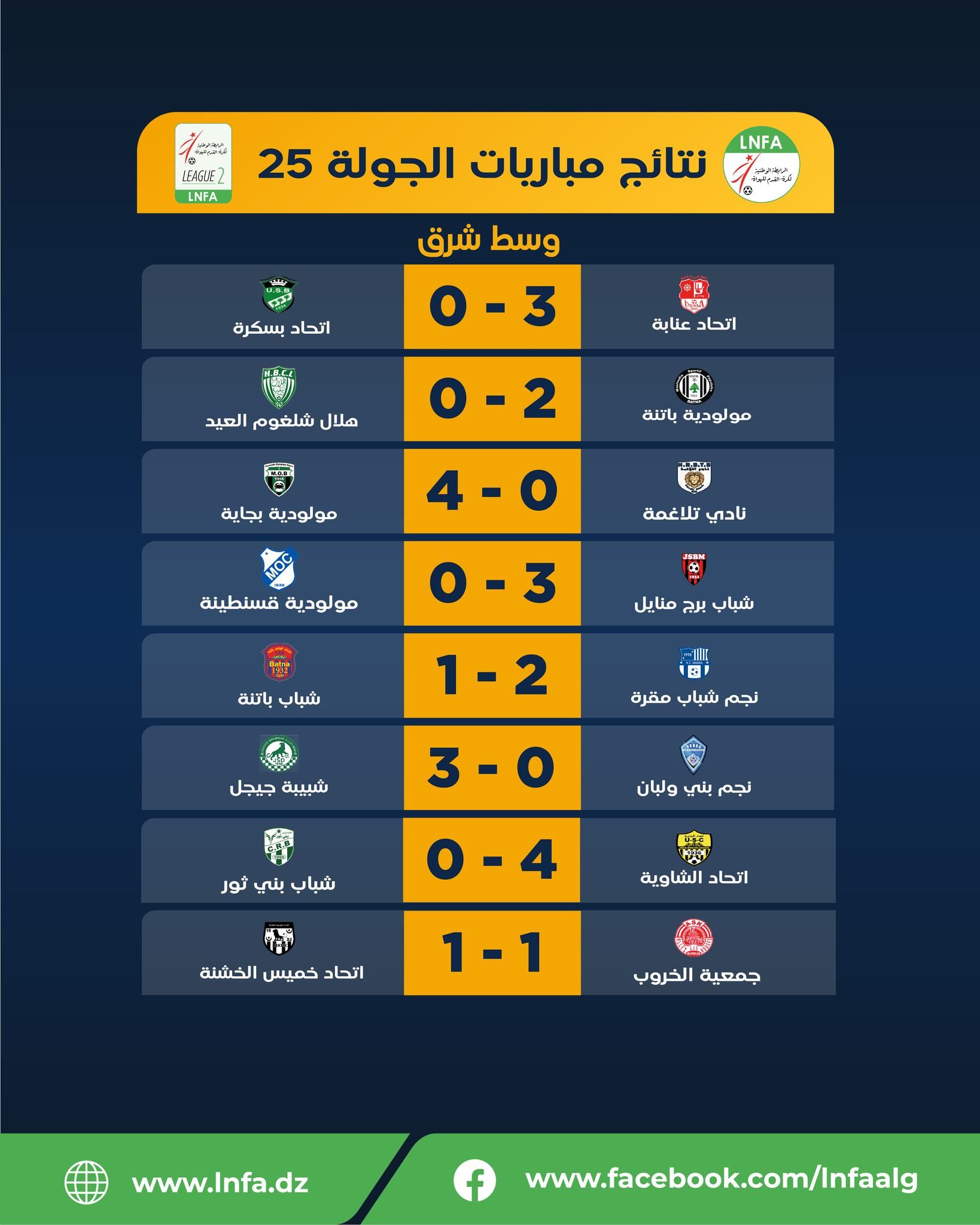 في مجموعة وسط-شرق، اشتد الصراع أكثر بعد هزيمة الرائد شباب باتنة في مقرة وملاحقه السابق اتحاد بسكرة في عنابة، حيث استغل اتحاد الشاوية هذه الفرصة على أكمل وجه واقتنص الوصافة بعد فوز كبير على شباب بني ثور 4-0، رافعا رصيده إلى 50 نقطة، بفارق نقطة واحدة عن "الكاب" صاحب الـ 51 نقطة.