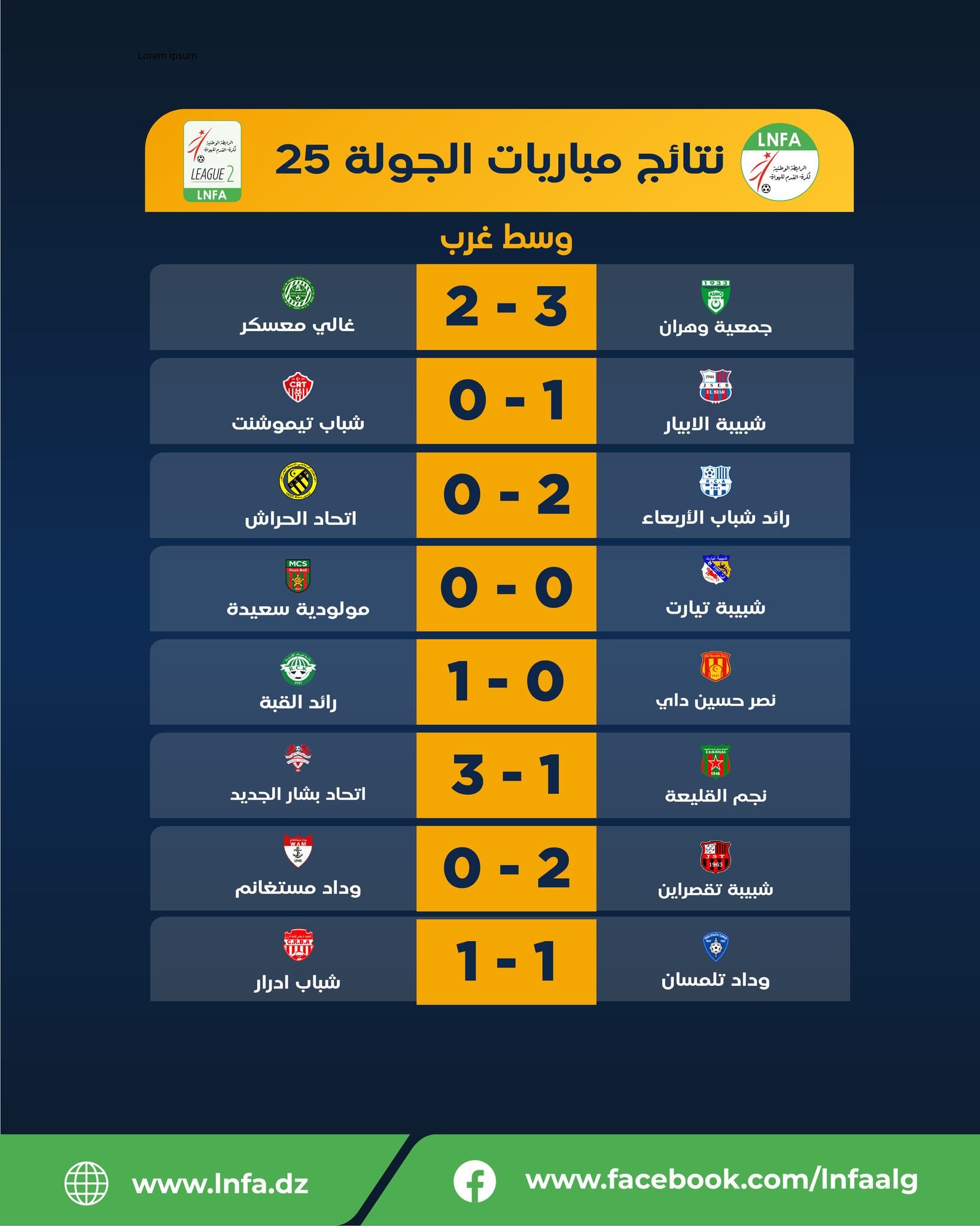 في مجموعة وسط-غرب، كان الحدث الأبرز توسيع الفارق بين الرائد وملاحقه إلى تسع نقاط كاملة، بعد فترة طويلة استقر خلالها عند ست نقاط. فقد تغلب شبيبة الأبيار على ضيفه شباب عين تيموشنت بهدف دون مقابل، فيما عاد اتحاد الحراش بهزيمة 2-0 من تنقله إلى مدينة الأربعاء أمام الأمل المحلي الذي يقاتل من أجل البقاء.
