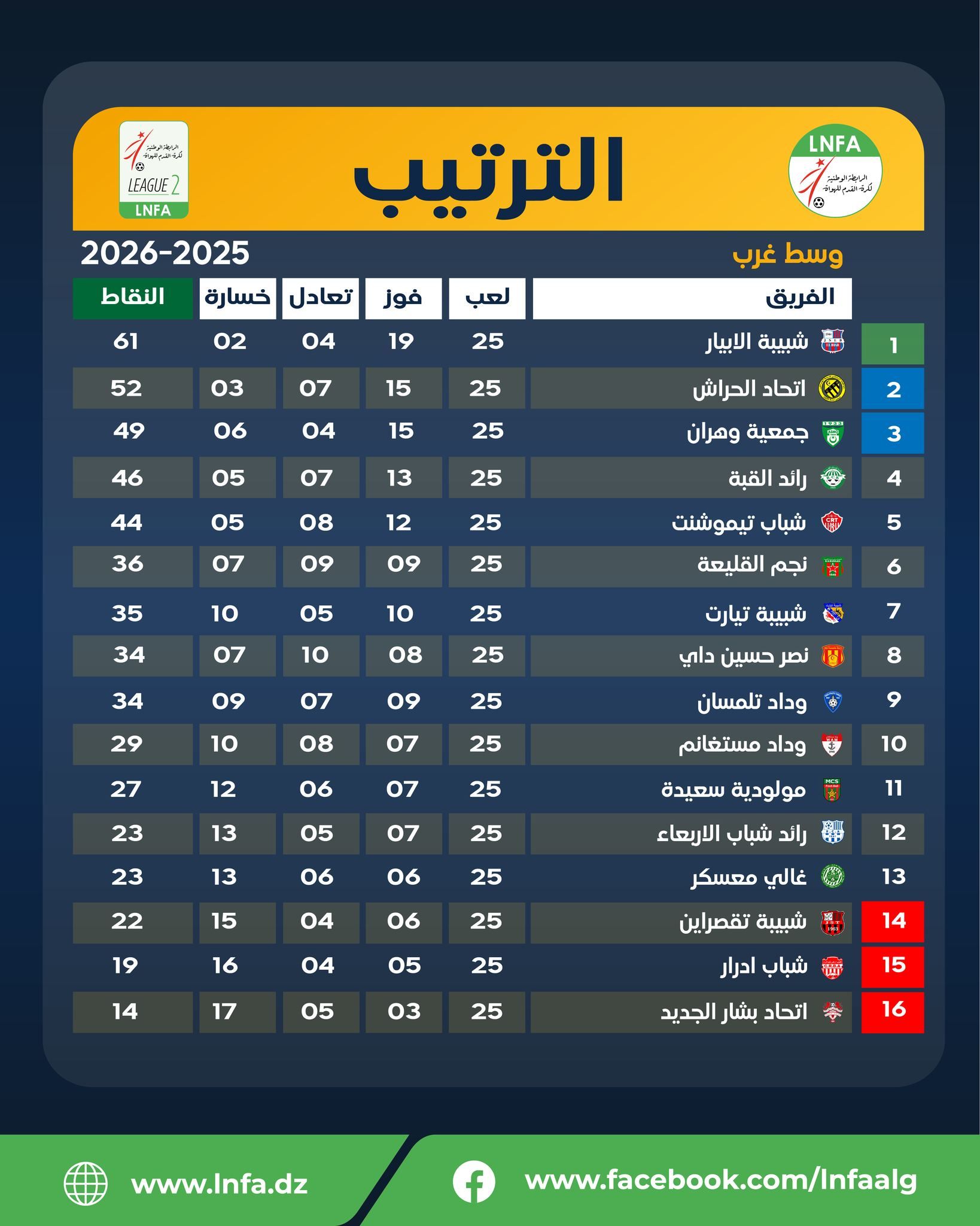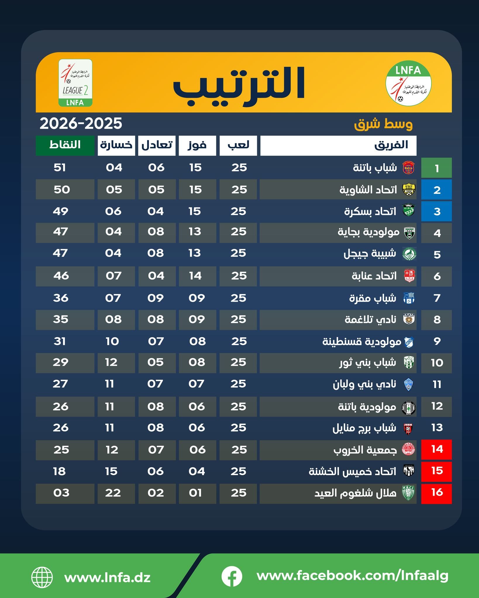 وتراجع اتحاد بسكرة إلى المركز الثالث برصيد 49 نقطة، متقدما قليلاً على مولودية بجاية وشبيبة جيجل اللذين رفعا رصيدهما إلى 47 نقطة لكل منهما بعد عودتهما بانتصارين ثمينين من خارج القواعد، فيما يراقب "أبناء بونة" السباق عن قرب برصيد 46 نقطة في المركز السادس.