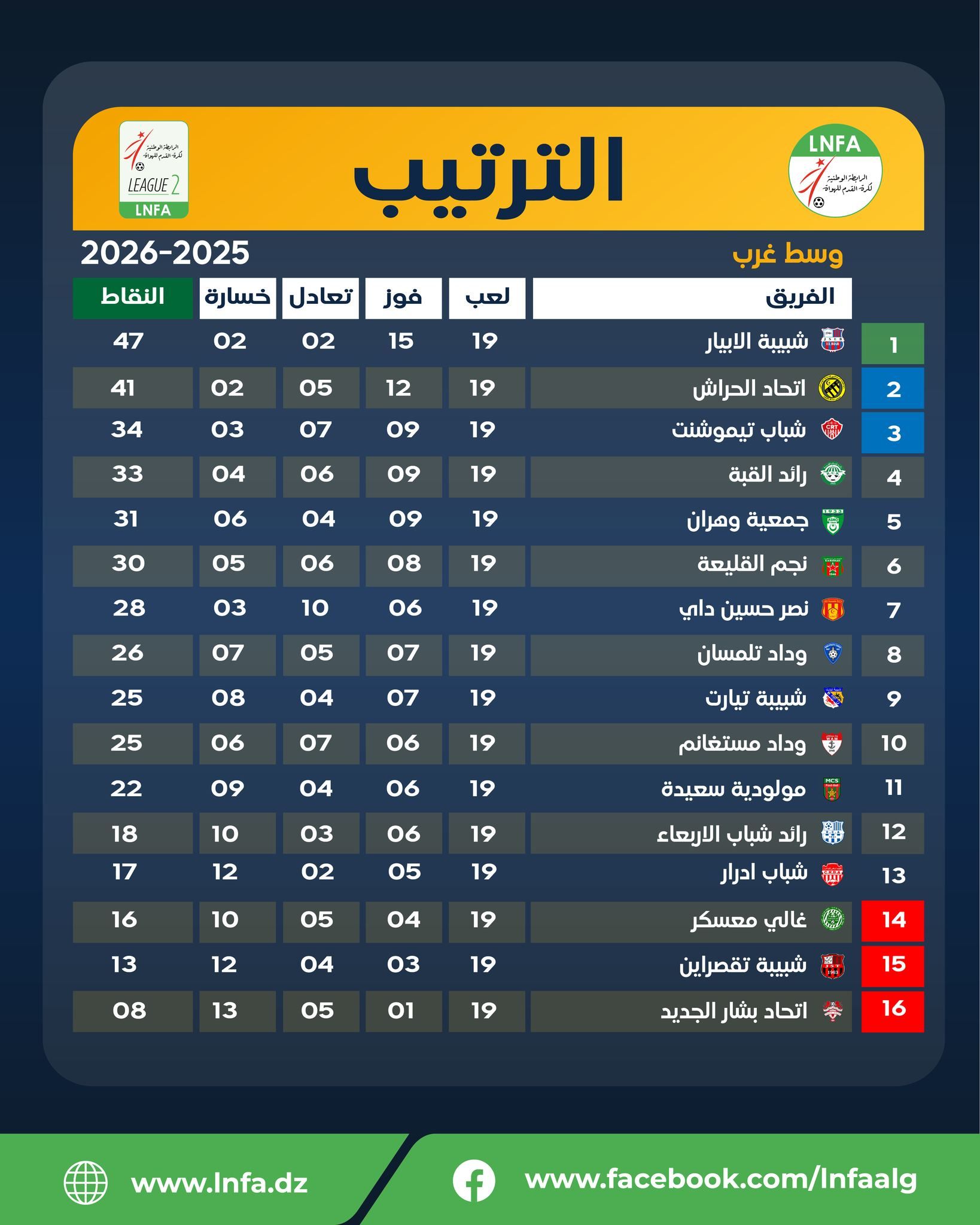 أما في صراع المركز الثالث، فقد حقق كل من شباب تموشنت (34 نقطة)، رائد القبة (33 نقطة) وجمعية وهران (31 نقطة) انتصارات مهمة، ما يزيد من حدة المنافسة بينهم على هذه المرتبة، في ظل ابتعاد ثنائي الريادة في الترتيب.