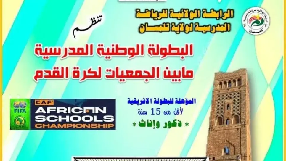 تنظم الفيدرالية الجزائرية للرياضة المدرسية بالتعاون مع الاتحاد الجزائري لكرة القدم بطولة وطنية مدرسية، خاصة بفئة أقل من 15 سنة تحت عنوان "فتيات وفتيان" في الفترة الممتدة من 18 إلى 24 جويلية الجاري بملعب العقيد لطفي بتلمسان. ومثل " الفاف" خلال عملية القرعة التي جرت بمقر الرابطة الرياضية المدرسية بولاية تلمسان رشيد آيت محمد رئيس قسم التطوير والنخبة. وسيكون برنامج المواجهات كالآتي: المجموعة الأولى: صلاح بك (سطيف)، خميس مغنية (تلمسان)، ماجن محمد (عين الدفلى)، مهداوي عبد السلام (تيميمون). المجموعة الثانية: بن زيدون حروش (سكيكدة)، كركاب قدور (البيض)، بنزة مصطفى (مستغانم)، بلعاوش بر...