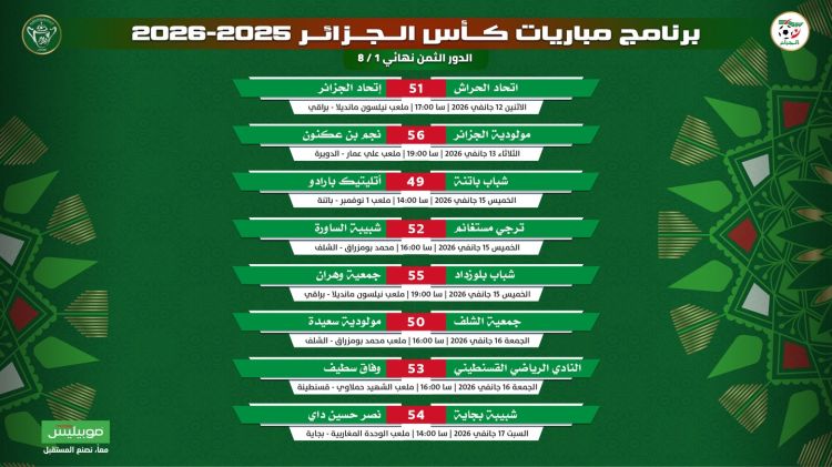 أعلنت الاتحادية الجزائرية لكرة القدم، اليوم الثلاثاء، عن البرنامج الكامل لمباريات الدور ثمن النهائي من كأس الجزائر لموسم 2025-2026، والذي سيُجرى على مدار خمسة أيام خلال شهر جانفي المقبل.